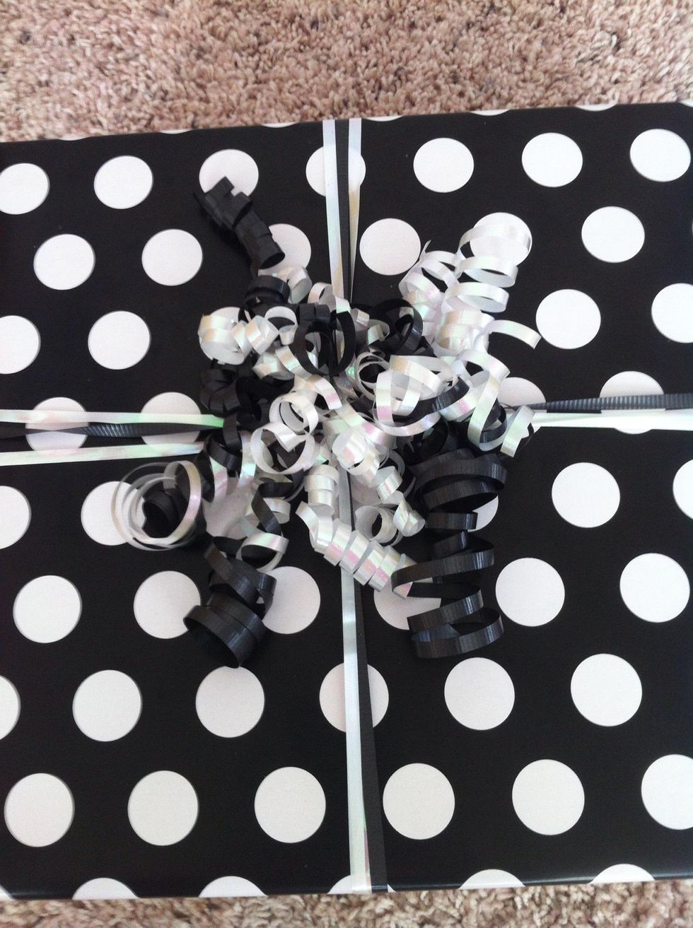 First start with tying 2 white and 1 black ribbon around your gift.