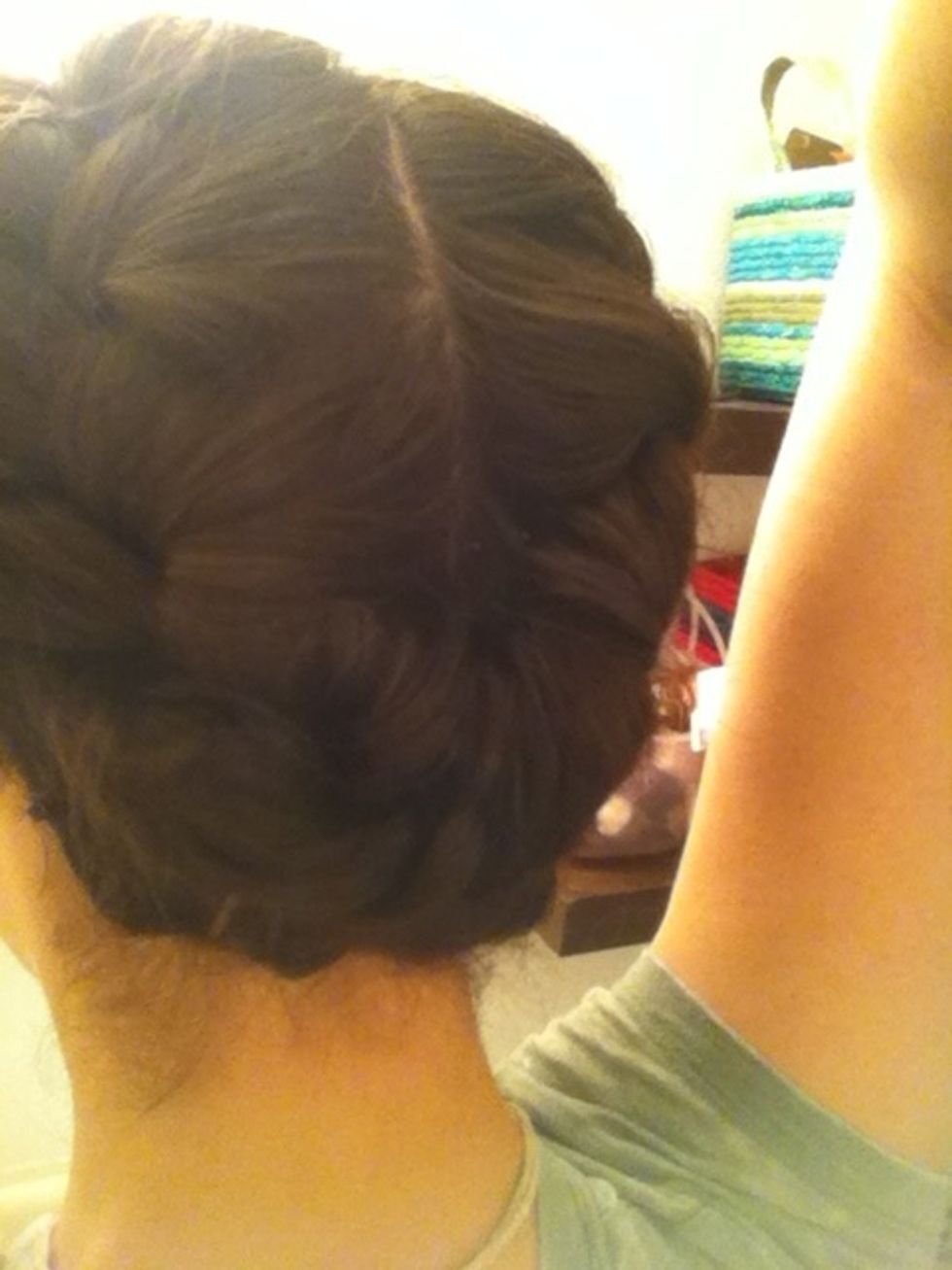 Then take the right side and pull it over the left. Tuck it a little under the left braid. Make sure your pins are secure!!