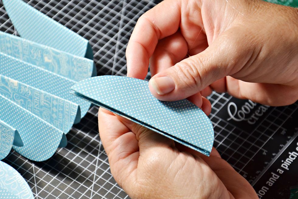 We are creating 2 halves of the egg, so you will need to glue 6 together as shown, then repeat the process with the other 6. PLEASE NOTE - only glue along the folded edge only.