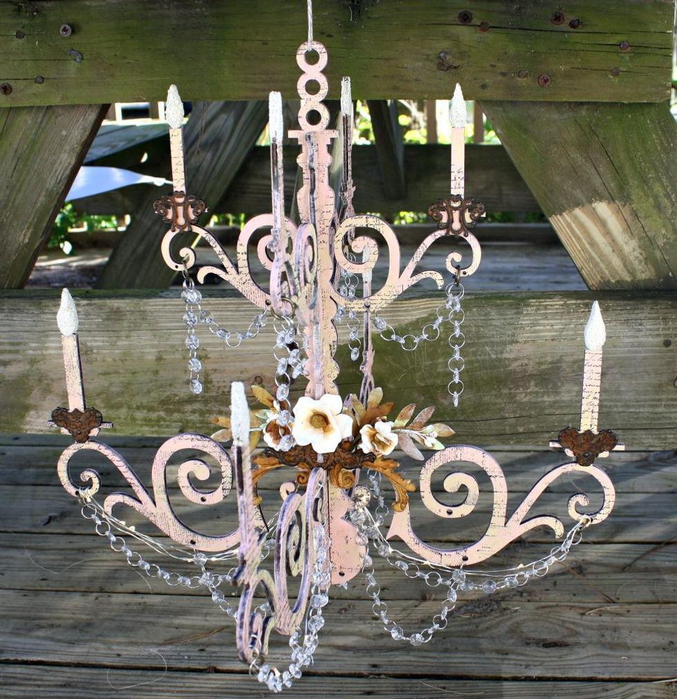I added an Esperenza flower spray, and some IOD molded shapes from paperclay. I also added Lumies mixed in with my chandelier adornment chain. Now it twinkles so prettily at night!