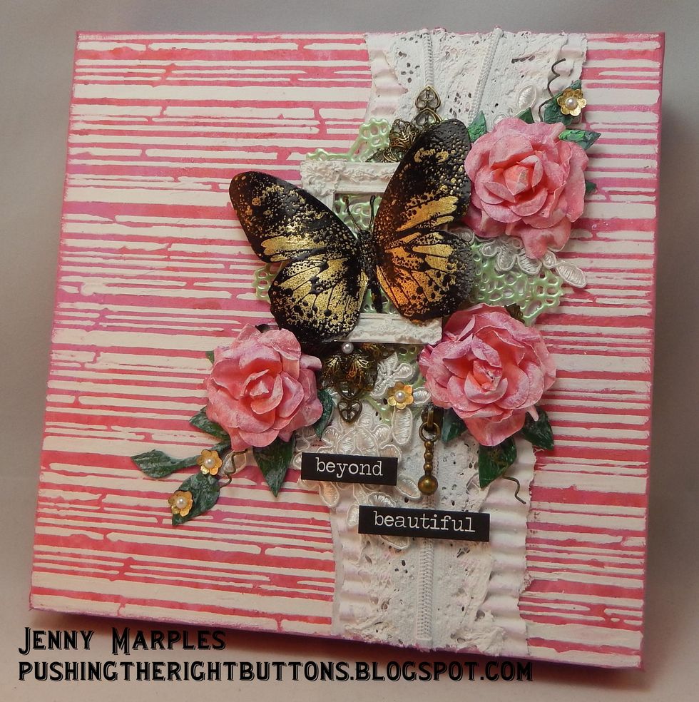 I added pieces of lace, a doily and a small fancy resin frame painted with the white gesso as a base for the final embellishments.