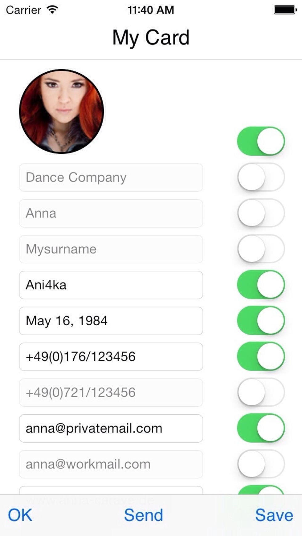 Creating a dynamic business card is simple, if you use vCardSender2 from the AppStore.