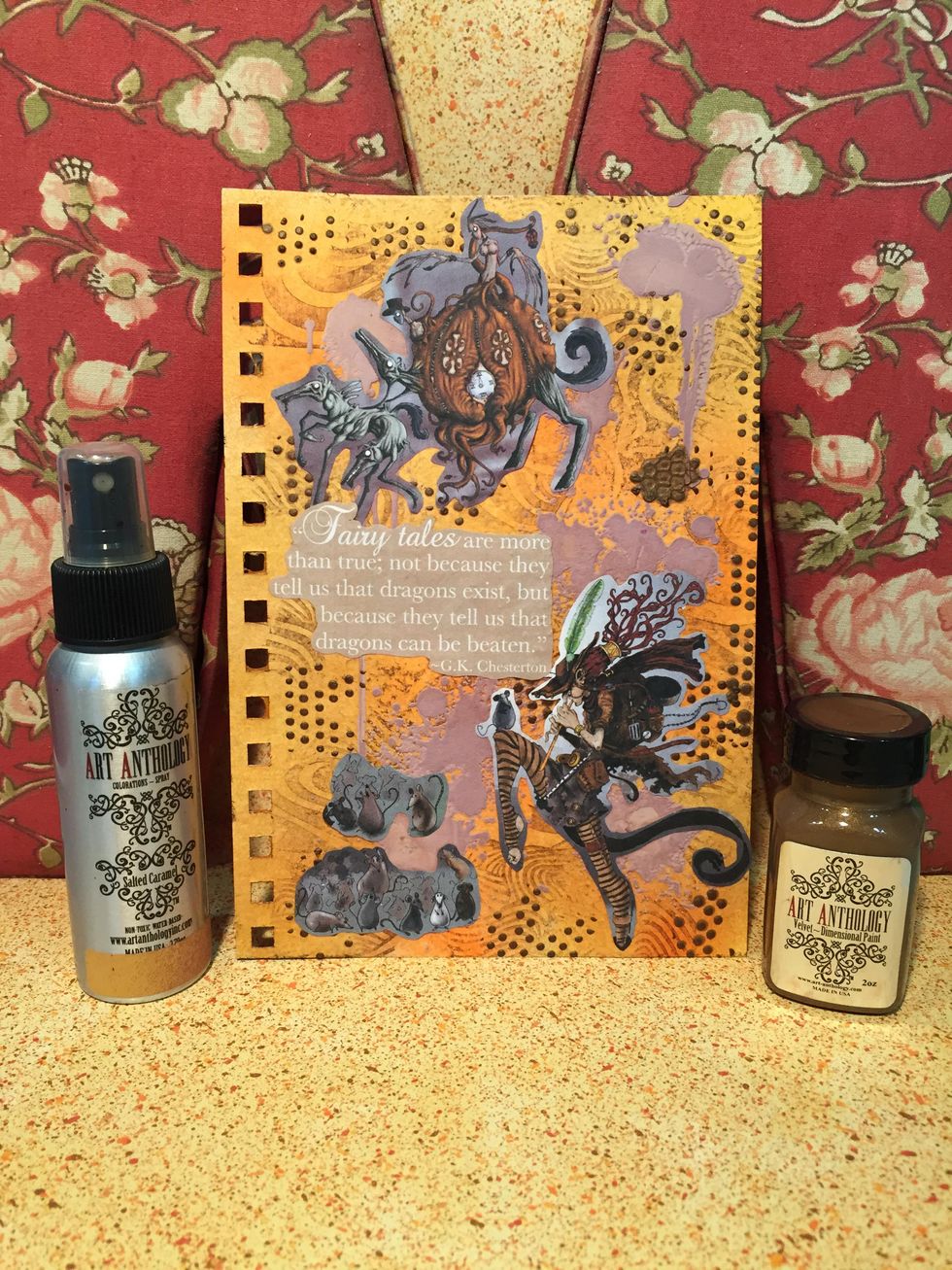 FOR THE FRONT: Spray Salted Caramel and Juicy Colorations onto your journal page and let dry. Blot any excess with a paper towel.