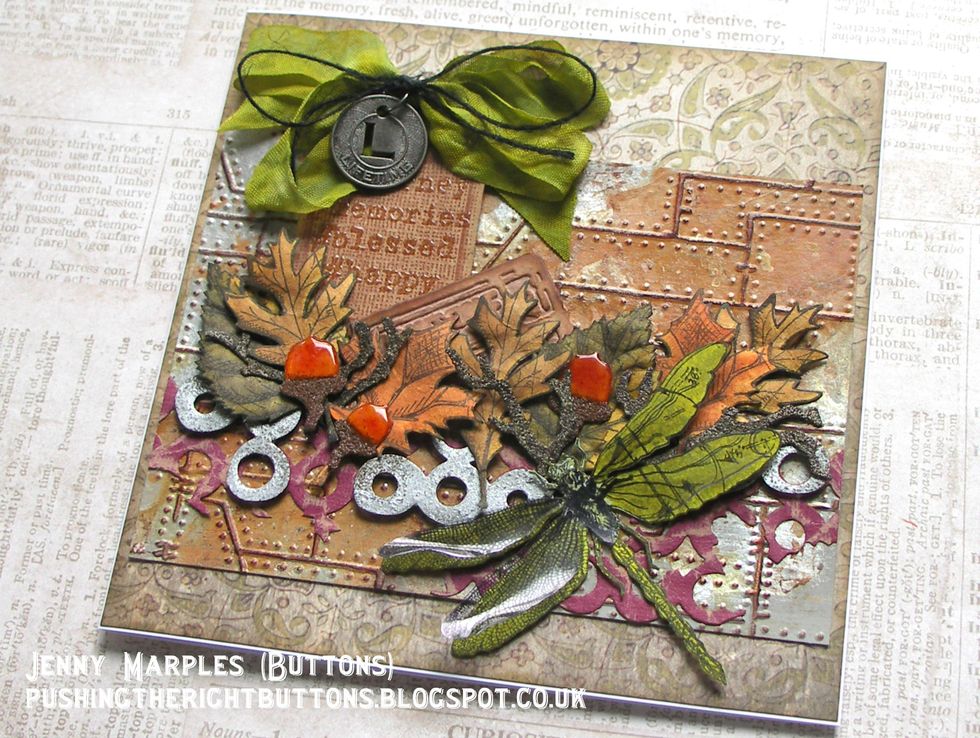 I used this rusted background on some patterned paper and added lots of Autumnal stamped leaves, textured die cuts, an embossed tag and dimensional dragonfly. What would you add to it?