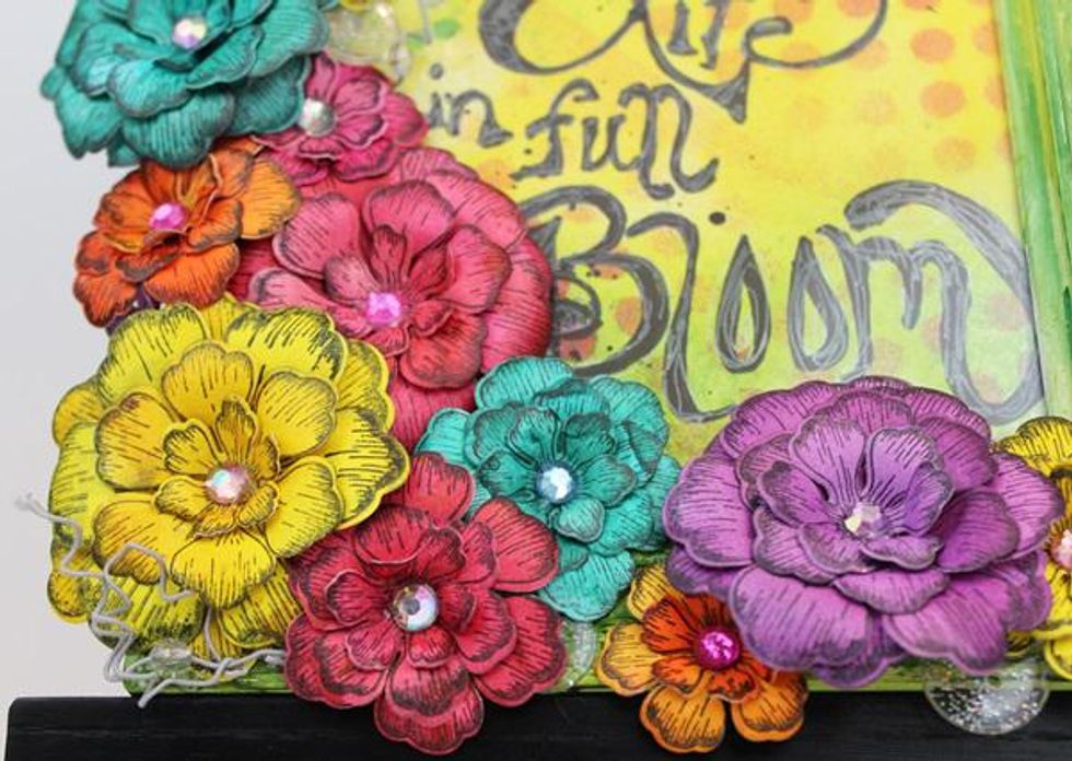Next using mix of Colorations spray completely cover several sheets of cardstock, once theses sheets are dry stamp and die cut your flowers out using Heartfelt's- Arianna Blooms set.