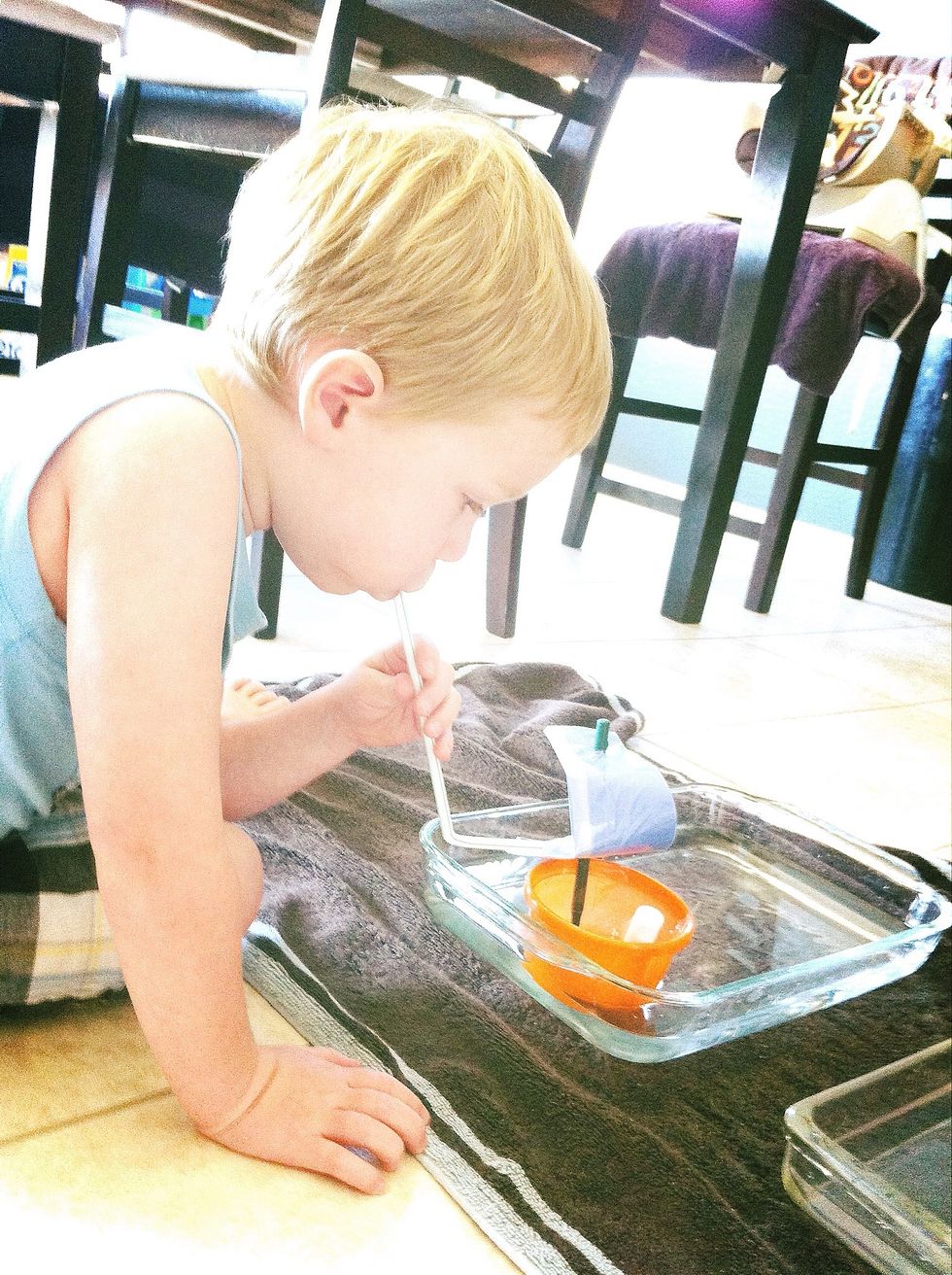 Set baking dishes full of water on floor. If inside, put a towel down first. Place boats in the water. Use bendy straw to blow into sails!