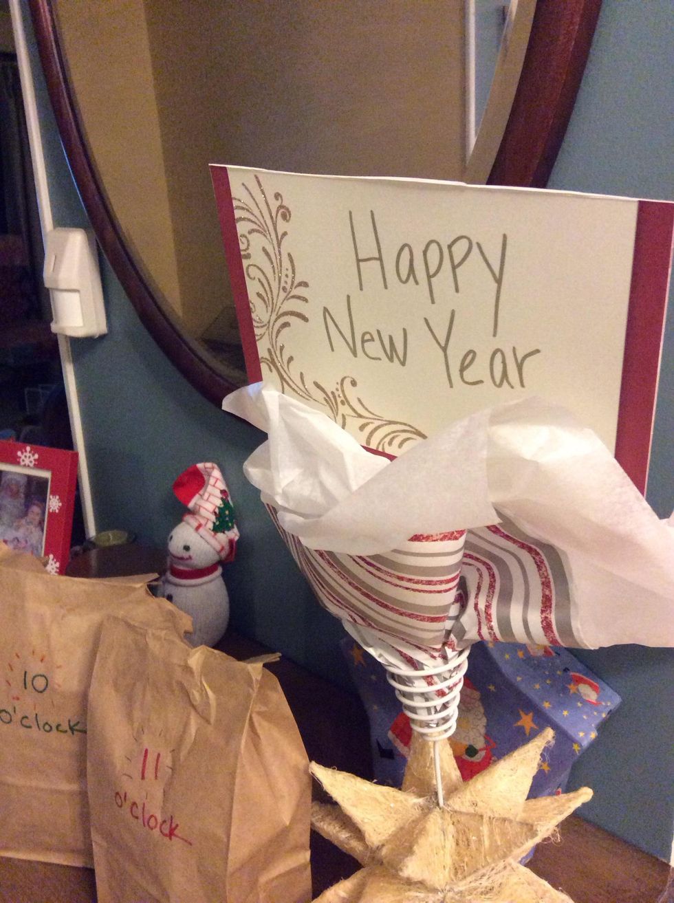Count up to 11 o'clock. Make a Happy New Year sign to represent midnight (I used the inside of a Christmas card).