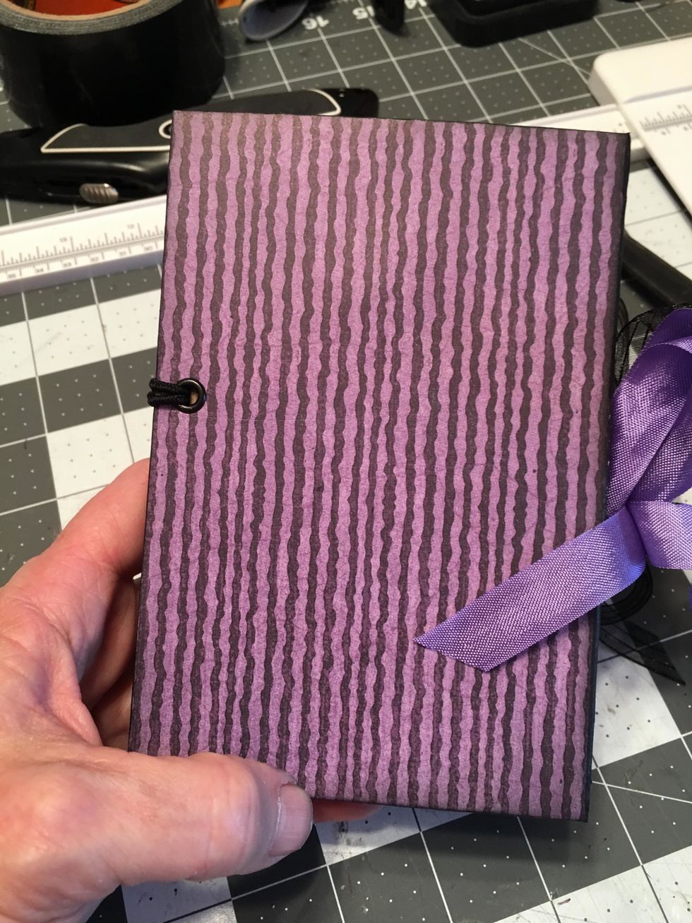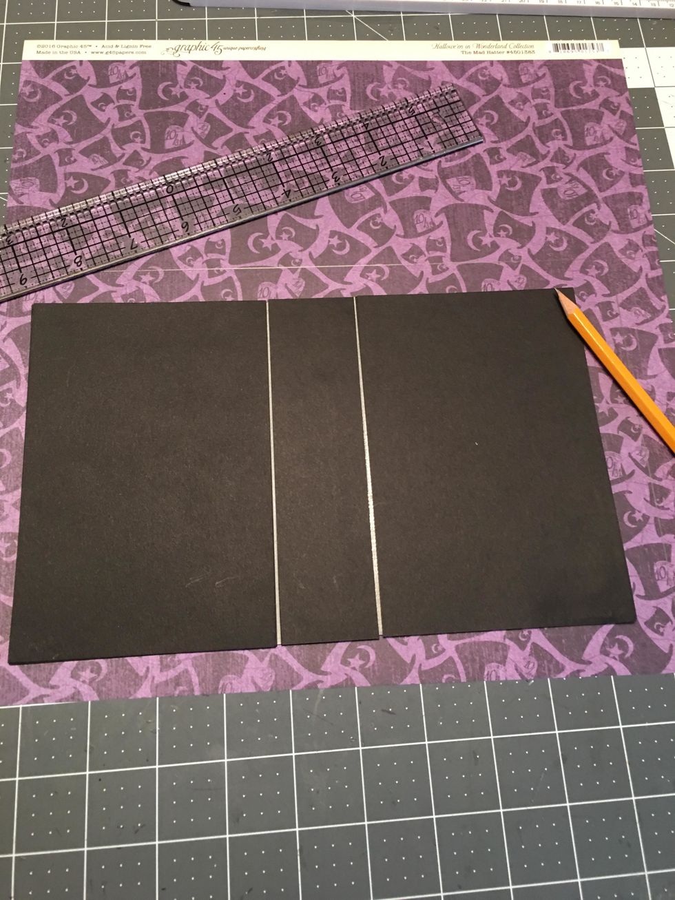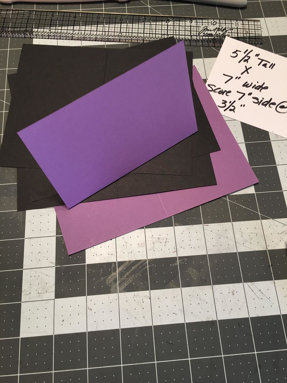 Cut cardstock in black and purples to 5.50" tall x 7" wide. Score the 7" side at 3.50" to fold the paper in half to make page signatures.