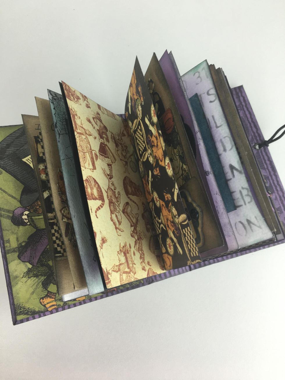 Cut assorted sizes of the patterned paper and fold into signatures. You will want a few of them to be the same size as the black and purple page signatures.