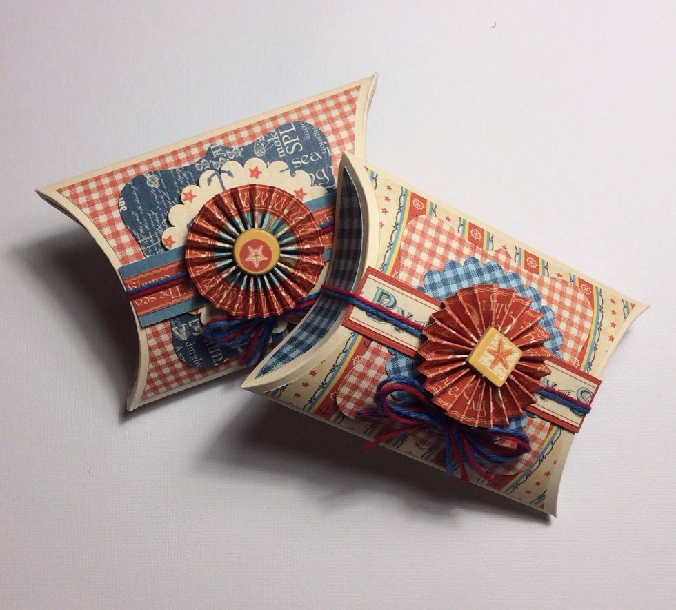 Tie bakers twine around pillow box , then adhere rosette and bakers twine bow in to position. Your box is now complete.