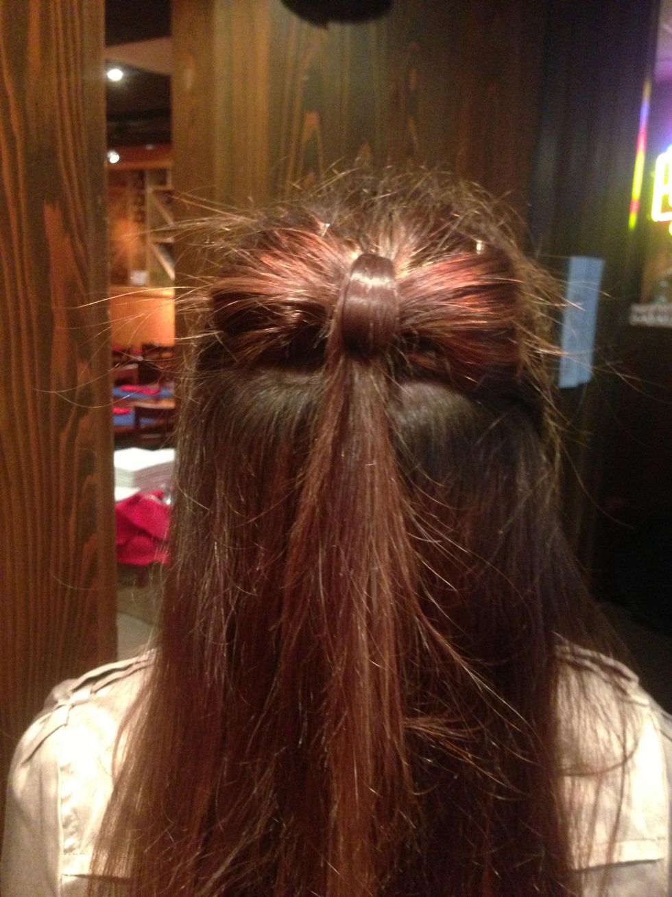 Tie your ponytail but leave a small loop at the end. (This will be the base of your bow)