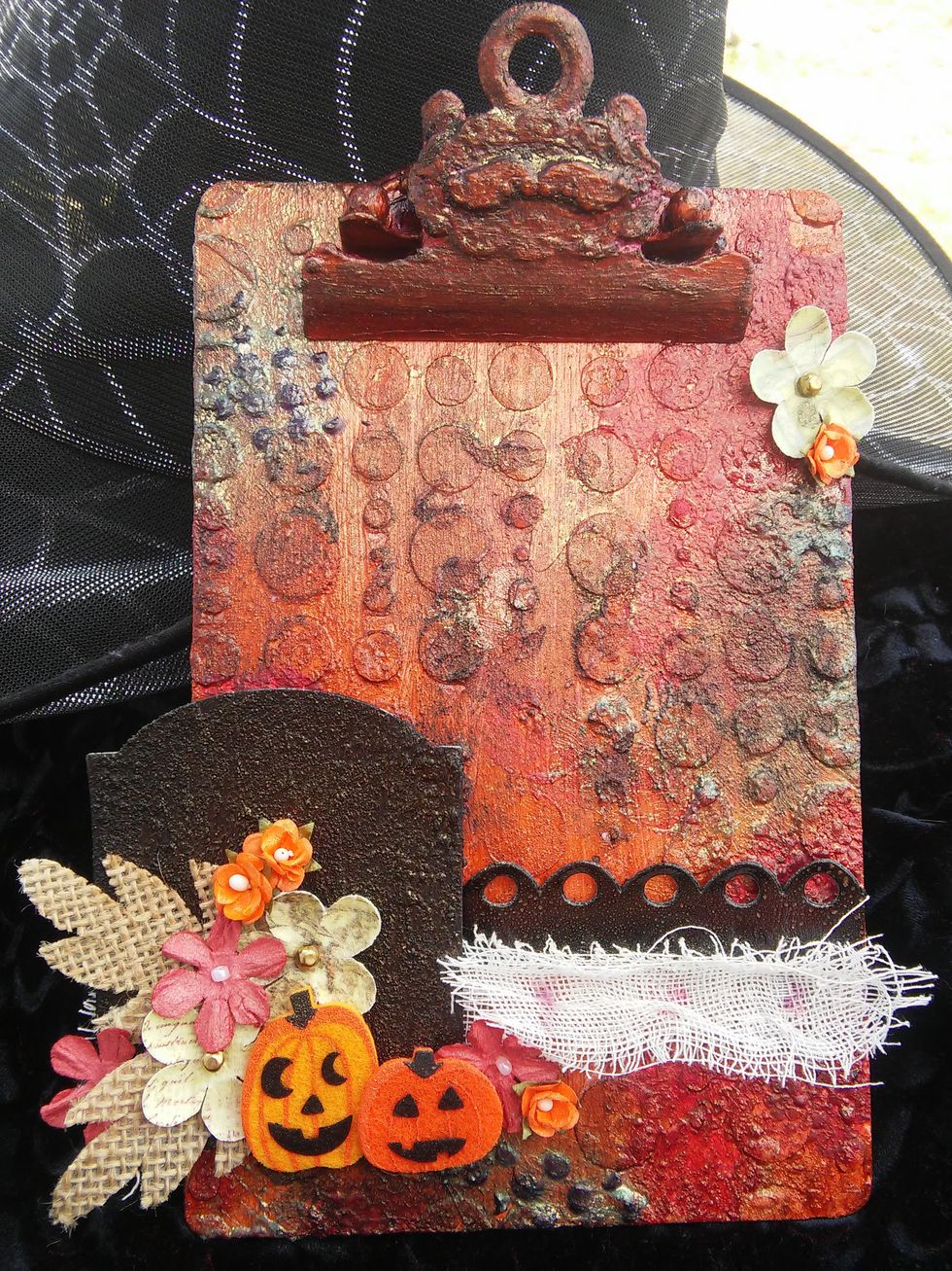 Time to make it a little spooky! With the Lava Stone Effects Dimensional Paint, I painted a headstone shaped tag and rubbed a few spots with my finger on the clipboard to make it look a little dingy.