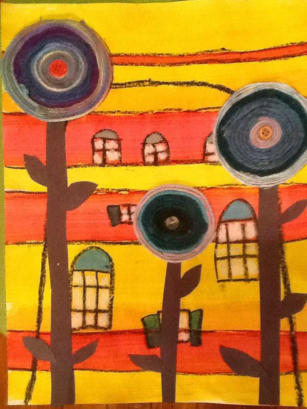 Use scraps of yarn to glue onto your piece. This yarn should be the OPPOSITE color of your paint. In my case, I painted my paper in warm colors, therefore my yarn is cool colors.