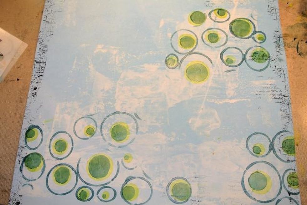 Stencil 3: With the third stencil the circles will fit on top of the circles from the second stencil. Add the second Gems mix.