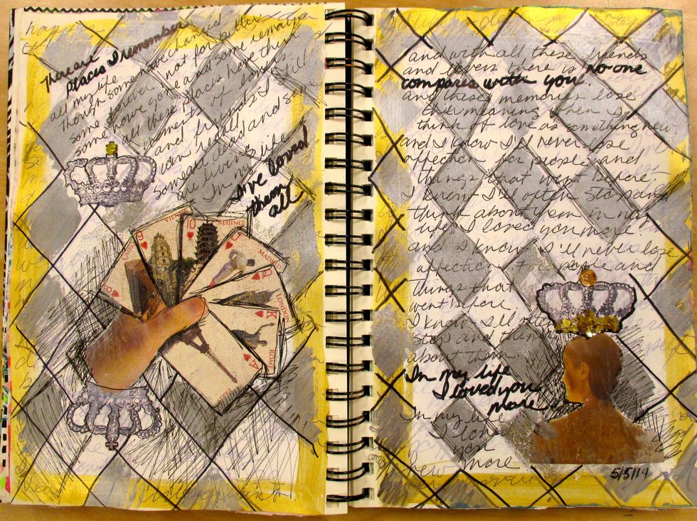 My favorite song pages. To prepare these pages I used acrylic paints (white, gold and silver). I added collage, then wrote and doodled with a fine point sharpie. Lastly the crown stamp and glitter.