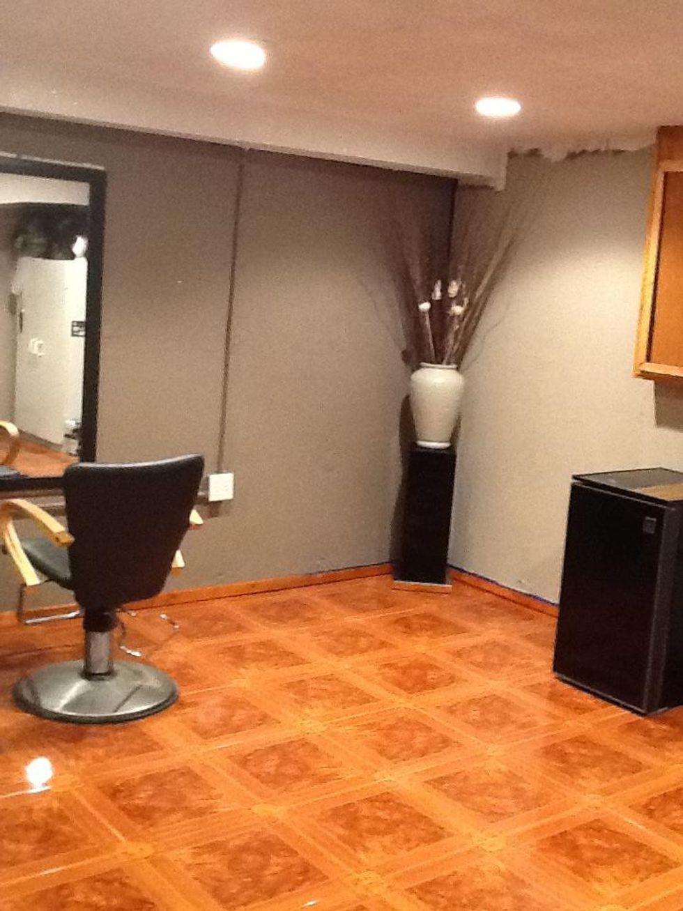 Floor after.. Purchased at a wholesale store. Ceramic tile, burl wood pattern. This was probably the most costly part of the salon.