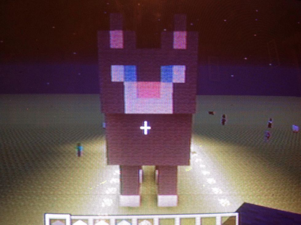 Then start body by the front legs . 8 blocks wide of gray and 5 blocks tall of gray .