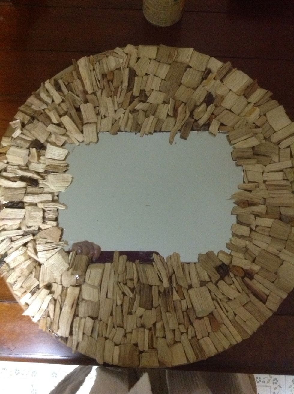 This is what the final project will looks like. Sorry I did not take more pictures. I still need to add wood chips around mirror to make it look rounder and a clear shellack of some sort or a stain.