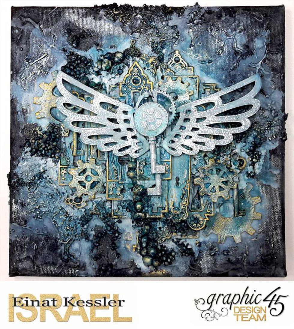 Spray on canvas until it's covered. Paint two keys and chipboard wings with white gesso. Adhere keys and wings to center of metal embellishments pile.