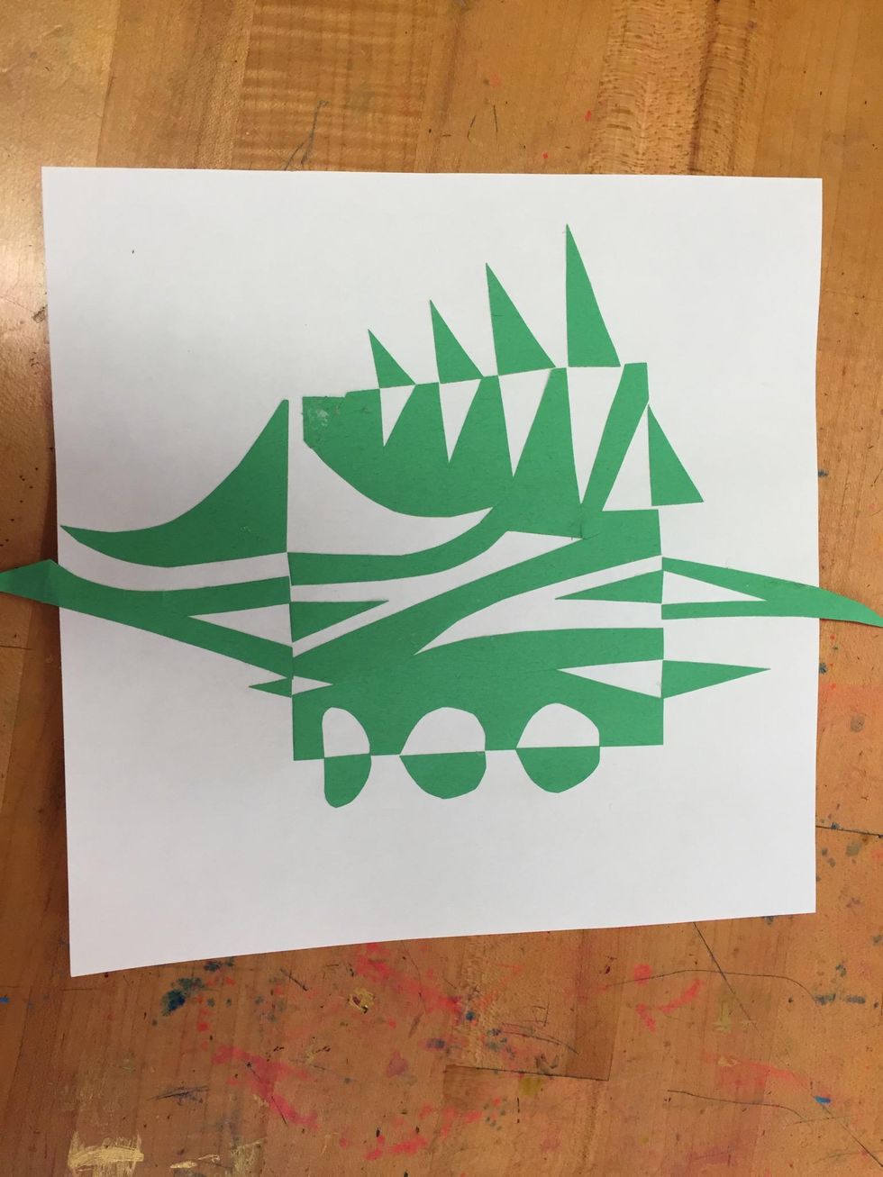 Glue down the cut shapes so that they create symmetry with the negative space beside them. Negative space is the colored portion, positive space is the white portion.
