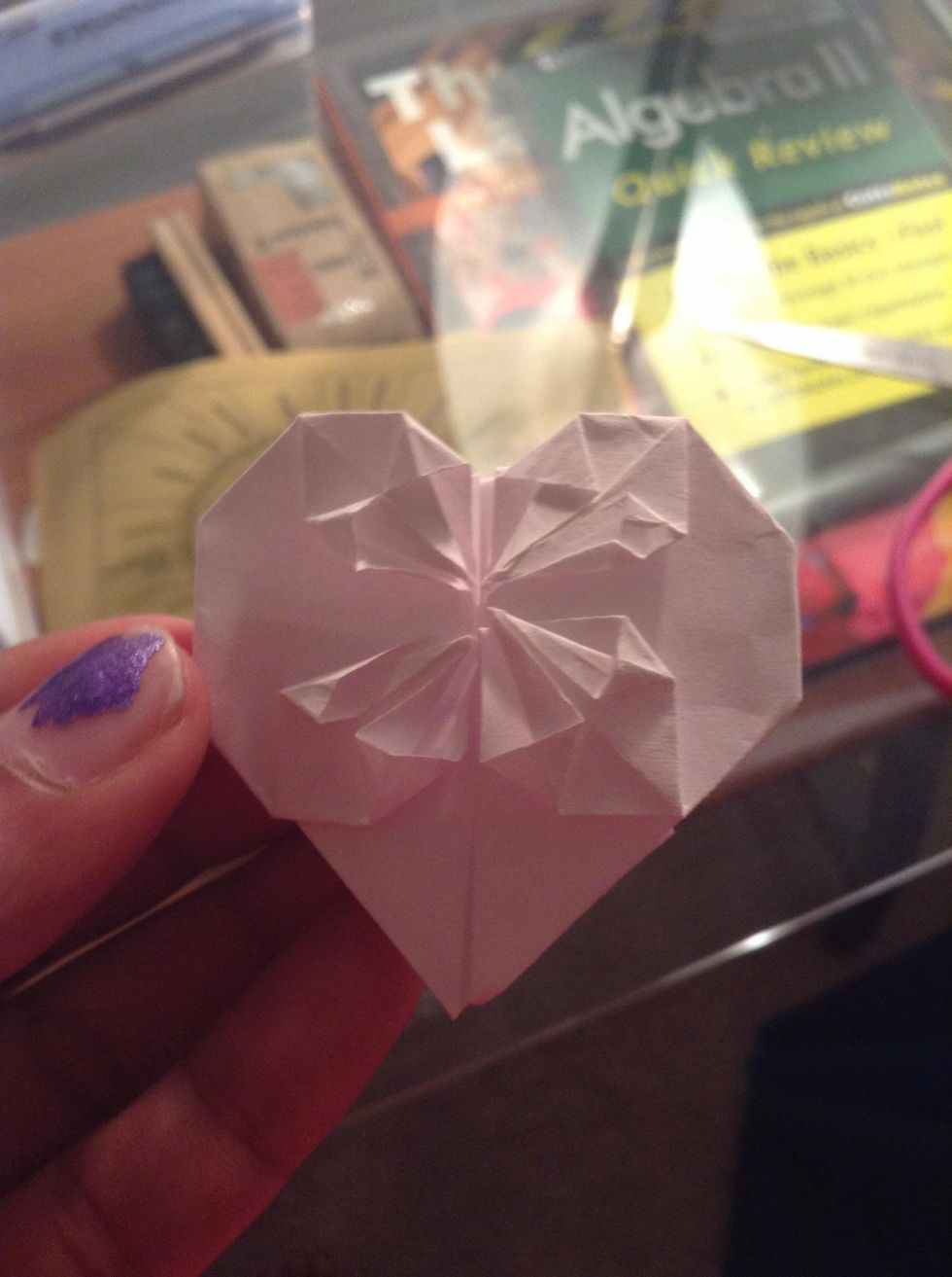 Fold the sides like that on both sides both ways.Then open it upFold it up like that both both sides.Put it like that and fold the side behind the heart then fold the top downFold the bottom triangles up.Then fold the side points to the inside.