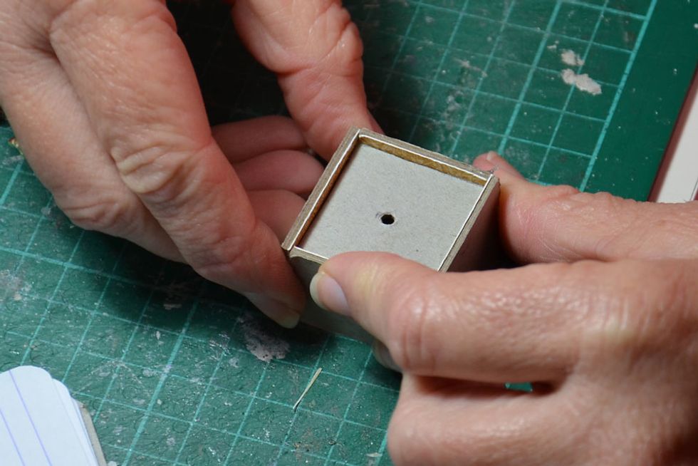 Punch holes in the centre of the top and bottom pieces of the balloon basket. These need to be just big enough to fit the skewer into.