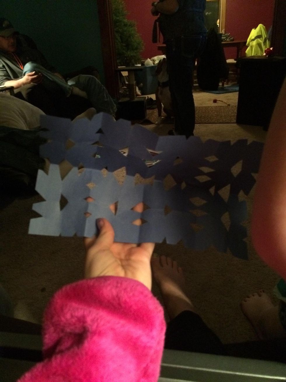 Fold in halfFold againFold one more timeCut triangles all aroundFold in half againCut a triangle in the middleUnfold it