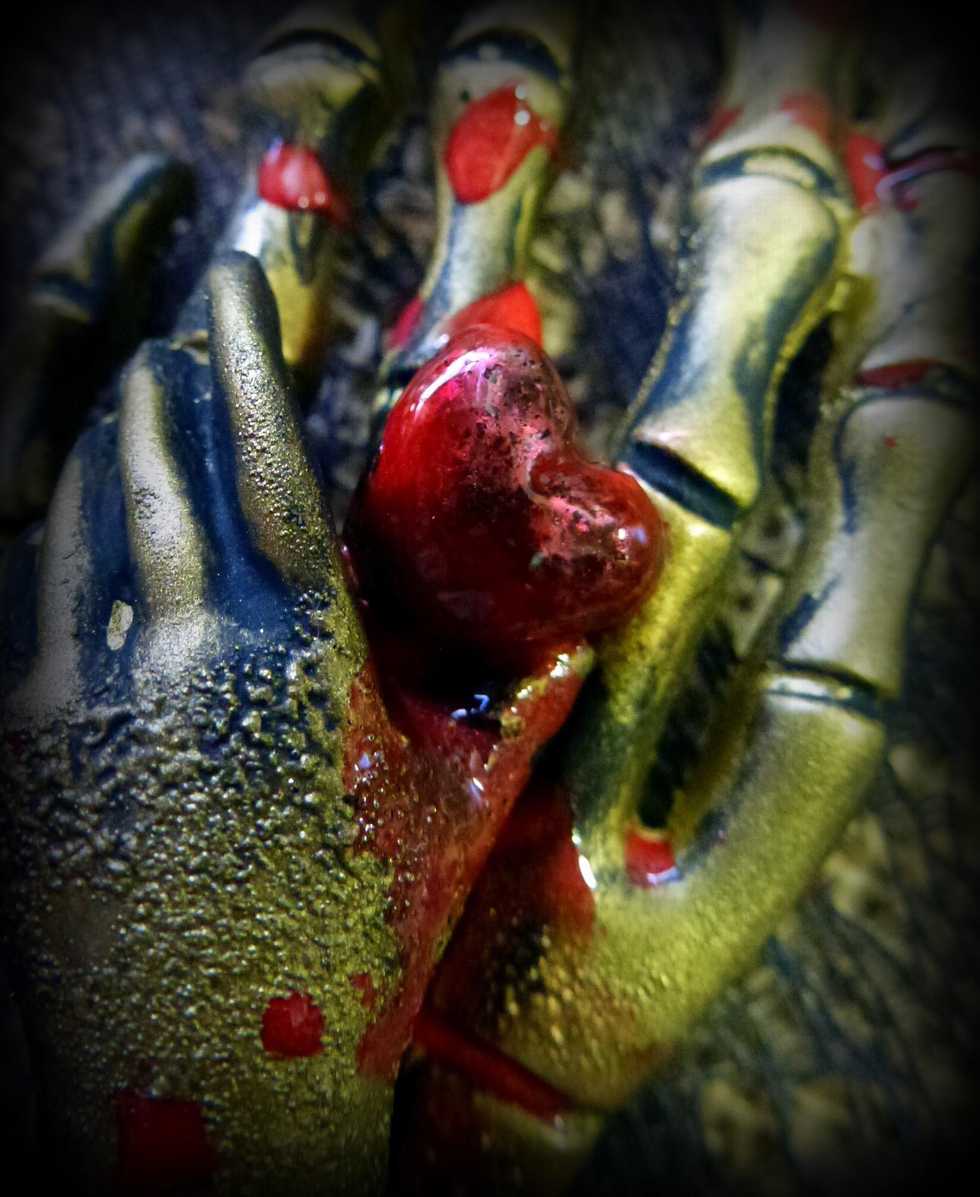 Paint the heart bead with red paint, and allow some of the paint to dribble down the hand so it appears as though the heart is bleeding.