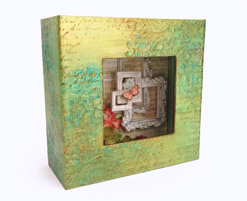 Use a flourish stencil, apply modeling paste over it randomly around the box...