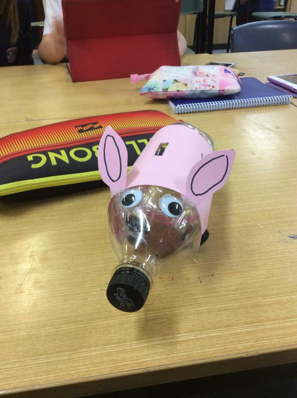 Before we begin, you will need a plastic bottle, pink cardboard, goggly eyes, hot glue gun, bottle caps, black texter and a sharp knife.