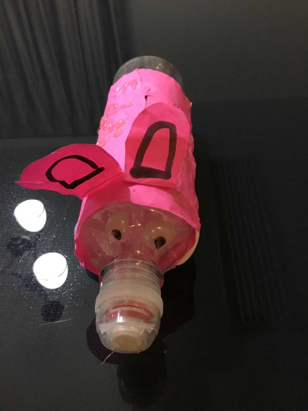 1.0 plastic bottle2.0 bottle caps2.0 eyes1.0 hot glue gun1.0 pink cardboard1.0 black texter1.0 sharp Knife