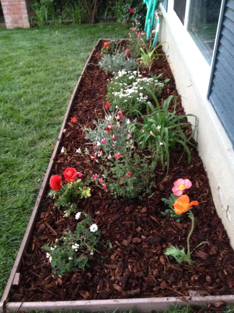 the finished product! here are a FEW of the flowers we chose for our box. our planter has strong sun in the morning, and some shade in the afternoon. with regular watering it will fill out soon!