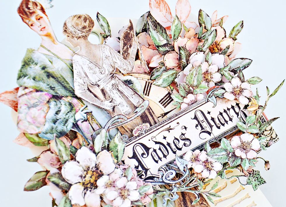 This is my finished pull out tag card. I chose to embellish with Graphic 45 Ladies Diary Collection.