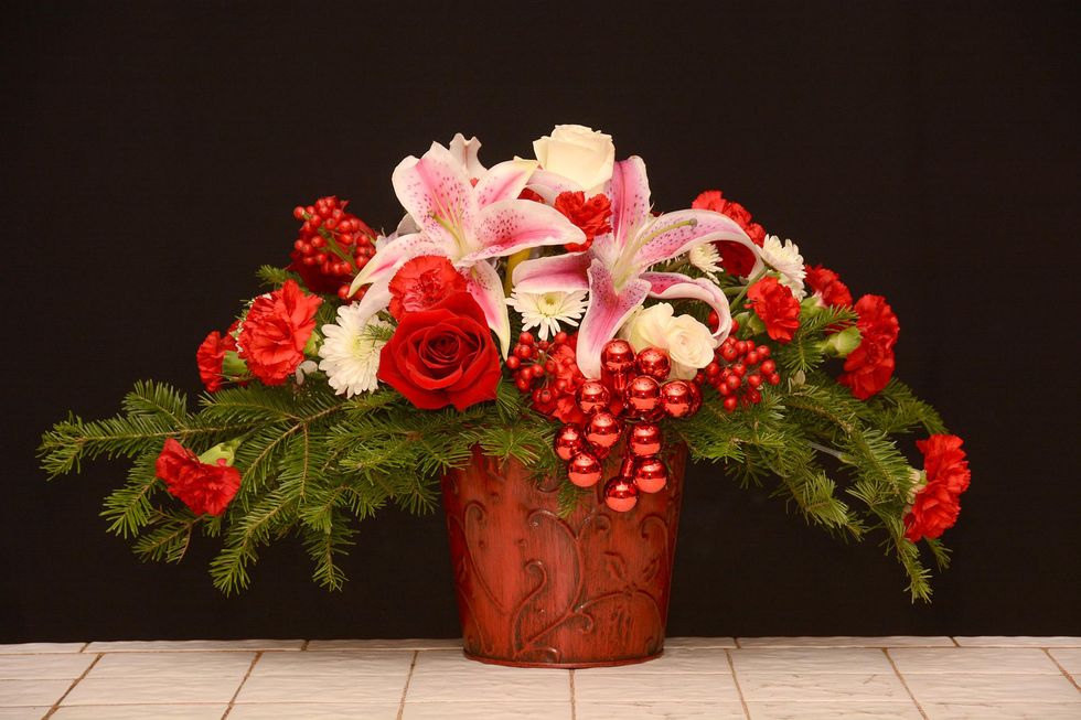 A few red miniature carnations and white pompons help to fill in the design and give greater visual impact….