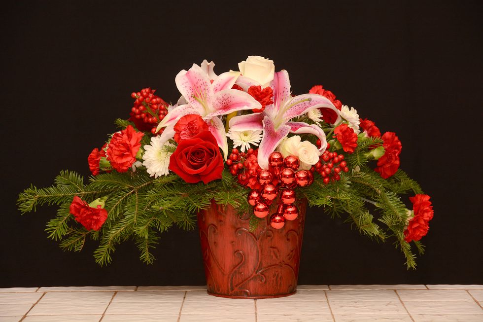 Notice that we picked a seasonally appropriate container, with a red color. Add foam to the container. Use Balsam or Fir to create a shape. In this case we are creating an oval shape.