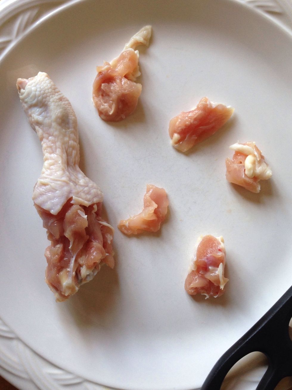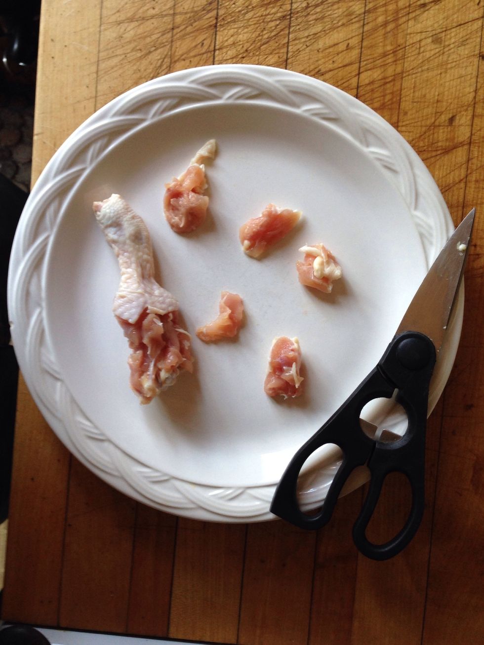 Using kitchen scissors, cut chunks of meat off the thigh.