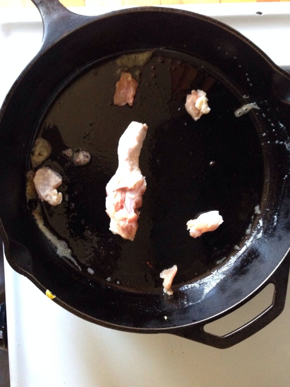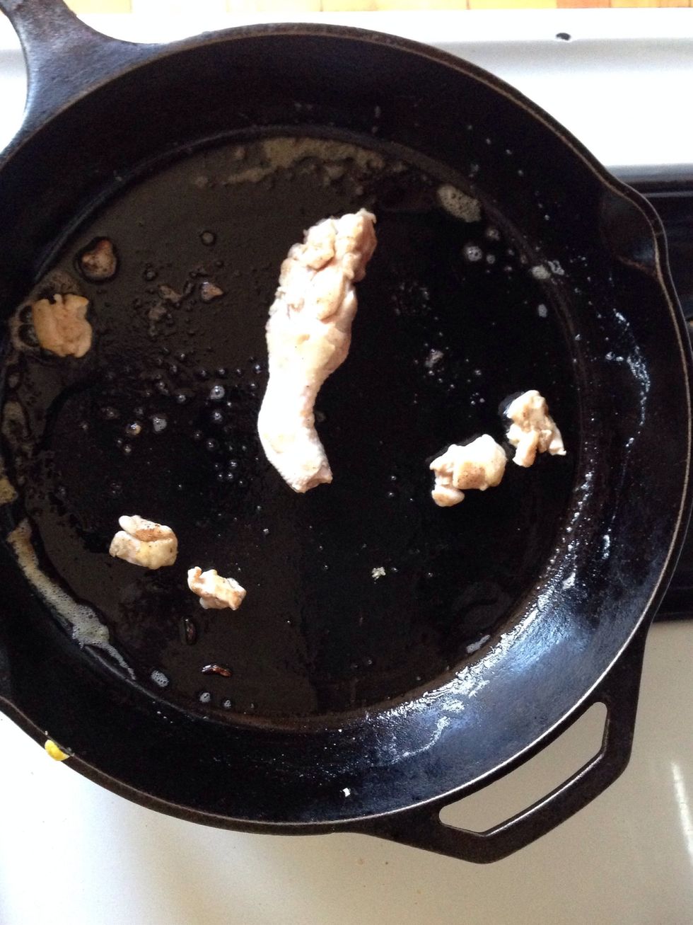 Place the chicken pieces in a preheated and (optionally) buttered pan. Turn so that the meat is slightly browned, but so that the most of the meat remains raw.