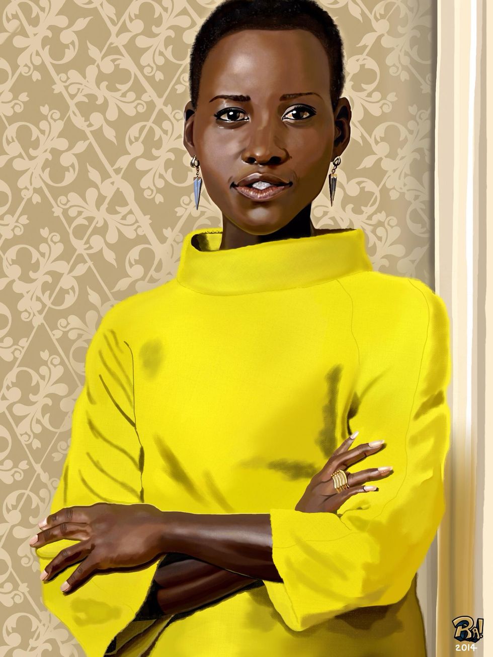 Finally I render the wall she's leaning on and use a texture brush called Victorian to create the finished wallpaper. There is also a faint shadow around her so that she pops.