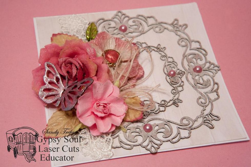 To create this romantic card, you will need the Gypsy Soul Laser Cuts 6" deco frame and inside frame piece, #D84C and one of the butterflies from D69A and other supplies as listed.