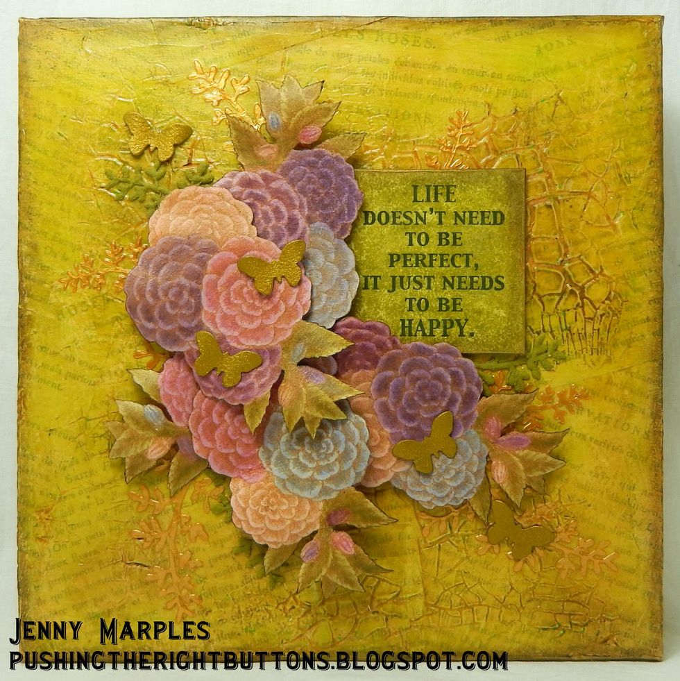 To finish, layer up your moulded flowers over the stencilled ferns. Add some little gold butterflies and a coordinating sentiment.