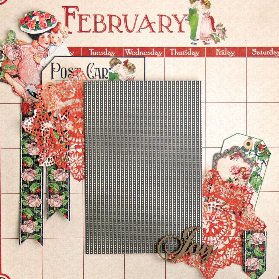 Cut tag shape from "February Collective" and add tag from the Tags and Pockets sheet. Place tags behind die cut doily at the lower, right side of the photo mat.
