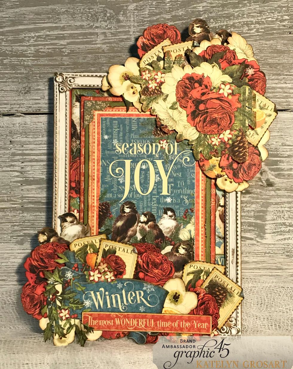 Adhere the Season of Joy layered paper to the inside of the frame.