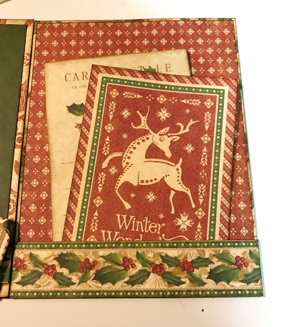 Adhere green holly border on 3 sides to the bottom of the papers. Slide 2 cards in the holly border pocket.