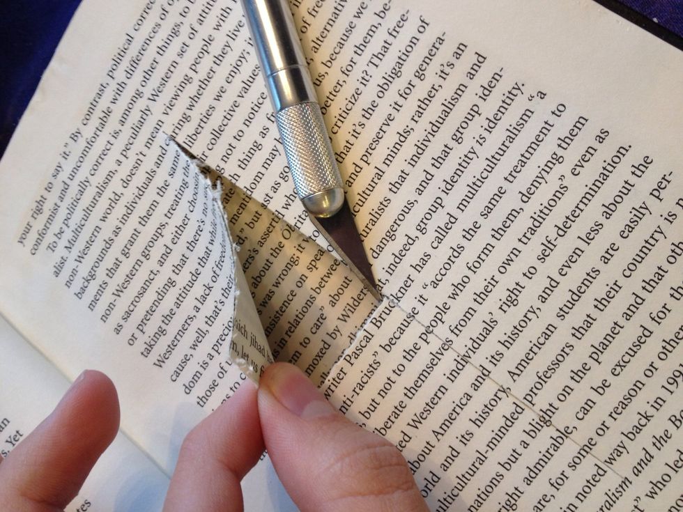 Now you have one or two pages that are covering the hole because they are glued to the outline. Start by cutting in the middle of these pages so you can work your way out to the edges.