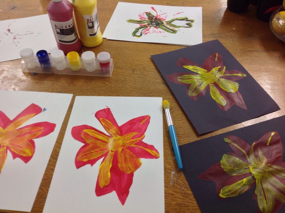 Here is the flower with the second layer. I don't let the paint dry completely as I like the blended look you sometimes get with the prints.