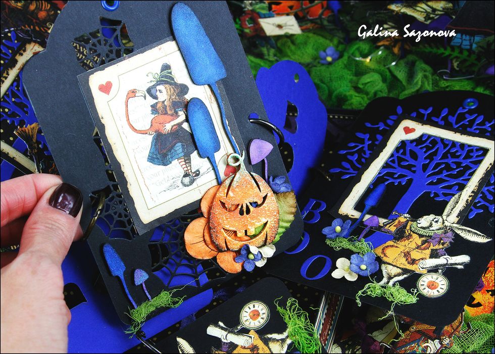 Наш альбомчик будет скреплен кольцами, поэтому пробиваем отверстия для них по краям тегов.