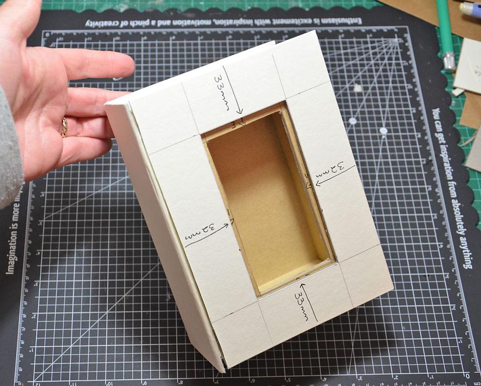 Measure 33mm from the top and bottom of the cover and rule lines. Measure 32mm from each side of the cover and rule lines.