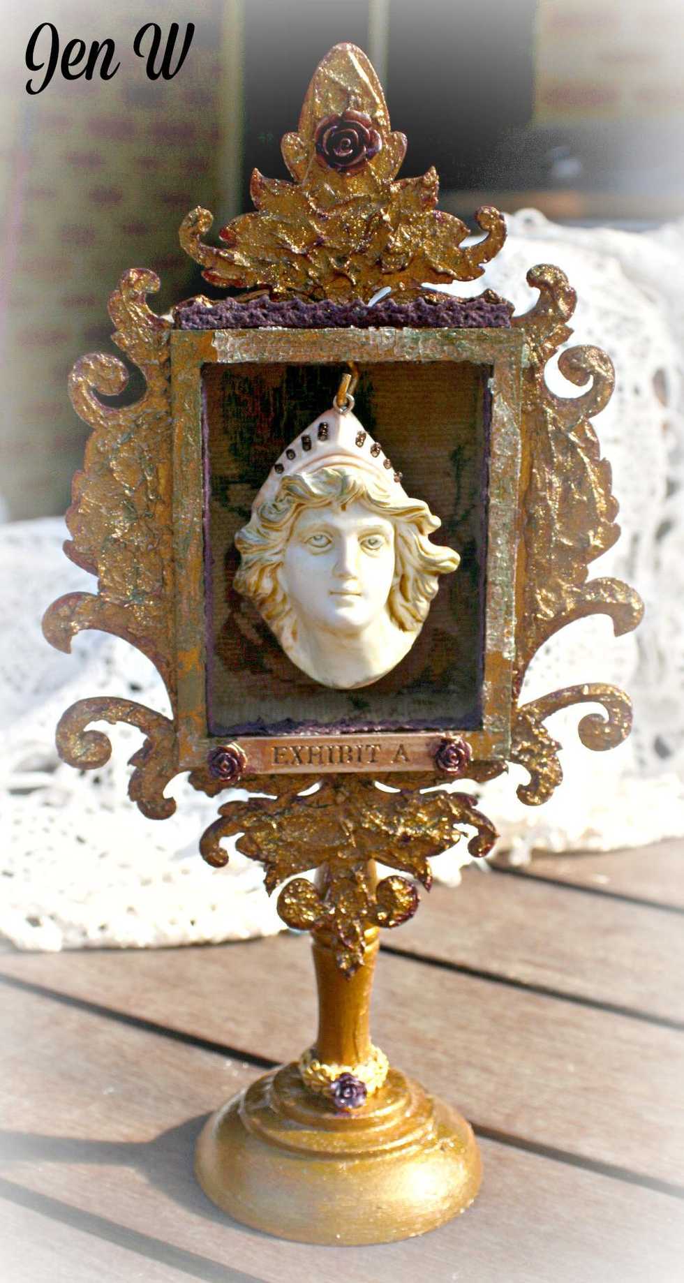 I painted my resin piece in thinned down acrylic paint to add a thin layer of colour. Some beads to the crown, trim on the inside edge and some crackle paint to the edge of the frame finished it off.
