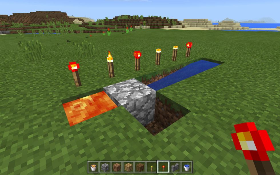 Finally, you place down a lava source on the far left and shortly after, a cobblestone should appear on the 2nd block to the left.