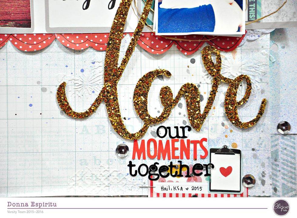With a stencil, apply modeling paste and let it dry. For the scalloped red and white polka dot paper, I manually cut it and draw around the edges using a black pen.